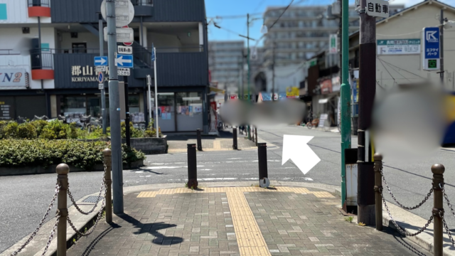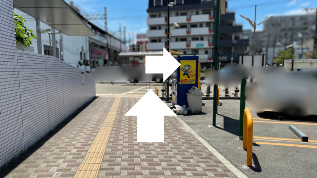 ①京阪大和田駅の改札を出たら左方向へ向かってください。![]() | ②出口2の看板も左に向かい歩いてください。![]() |