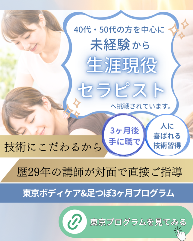 東京で生涯現役セラピストを目指す手に職をつける3ヶ月プログラムを開講します。詳しくは↓
